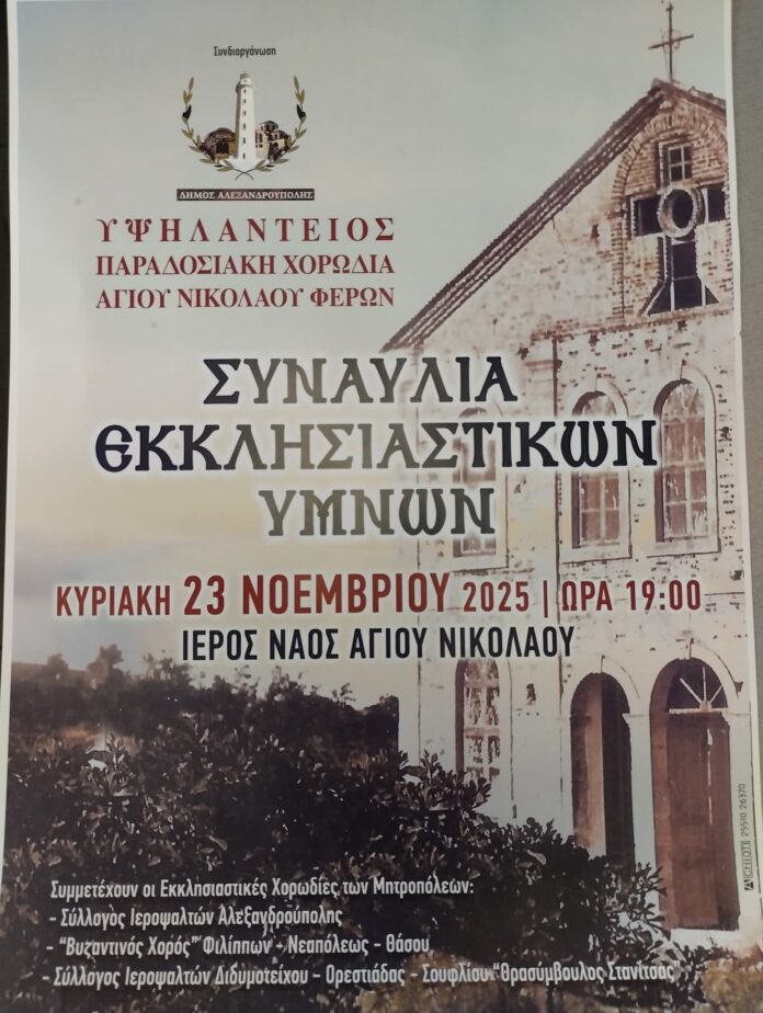 Ο Ιερός Ναός Αγίου Νικολάου Φερών συμπληρώνει φέτος 100 χρόνια από τα εγκαίνιά του (1925-2025). Στο πλαίσιο των εορτασμών, σήμερα Κυριακή 23 Νοεμβρίου και ώρα 19:00 θα πραγματοποιηθεί συναυλία εκκλησιαστικών ύμνων στον Ναό.