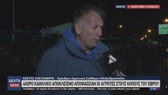 Στο δελτίο ειδήσεων της Δέλτα Τηλεόραση μίλησε ο πρόεδρος του Αγροτικού Συλλόγου Αλεξανδρούπολης, Κώστας Αλεξανδρής, μετά τα μέτρα που ανακοίνωσε η κυβέρνηση και την απόφαση των αγροτών για 48ωρο αποκλεισμό του τελωνείου των Κήπων, την Πέμπτη και την Παρασκευή.