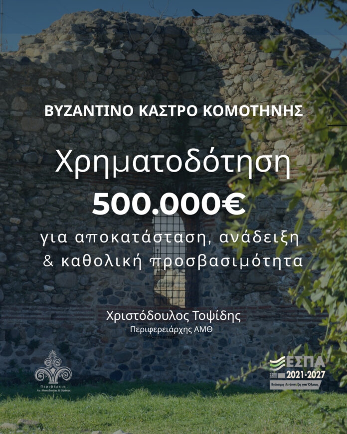 Στο Πρόγραμμα «Ανατολική Μακεδονία και Θράκη 2021–2027» εντάχθηκε η Πράξη «Προστασία και ανάδειξη του Βυζαντινού Κάστρου Κομοτηνής», με συνολικό προϋπολογισμό 500.000 ευρώ, μετά από απόφαση που υπέγραψε ο Περιφερειάρχης Ανατολικής Μακεδονίας και Θράκης, Χριστόδουλος Τοψίδης.