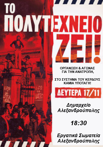 Τη Δευτέρα 17 Νοεμβρίου 2025, στις 18:30, στο Δημαρχείο Αλεξανδρούπολης, πραγματοποιείται συγκέντρωση τιμής και μνήμης για τα 52 χρόνια από τον ηρωικό ξεσηκωμό του Πολυτεχνείου (1973-2025).