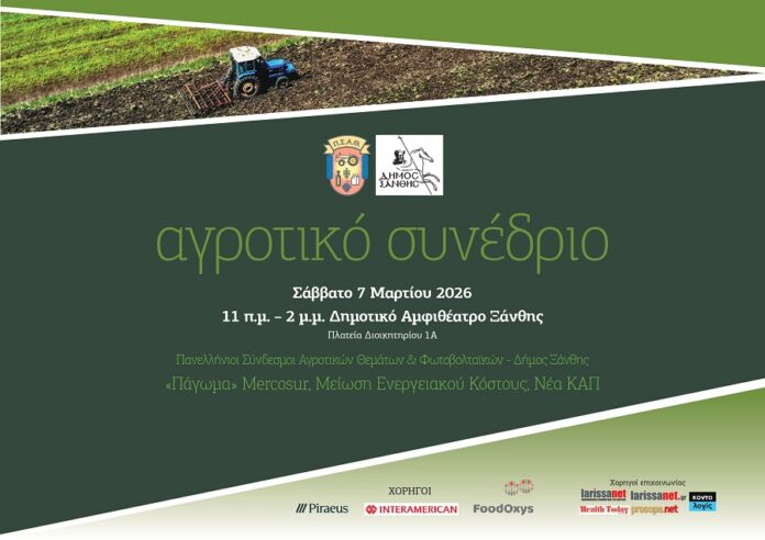 Ο Πανελλήνιος Σύνδεσμος Αγροτικών Θεμάτων (ΠΣΑΘ) και ο Πανελλήνιος Σύνδεσμος Αγροτικών Φωτοβολταϊκών (ΠΣΑΦ) οργανώνουν το φετινό τους αγροτικό συνέδριο στην Ξάνθη, στο ∆ημοτικό Αμφιθέατρο Ξάνθης, το Σάββατο 7 Μαρτίου 2026 και ώρες 11 π.μ. – 2 μ.μ.