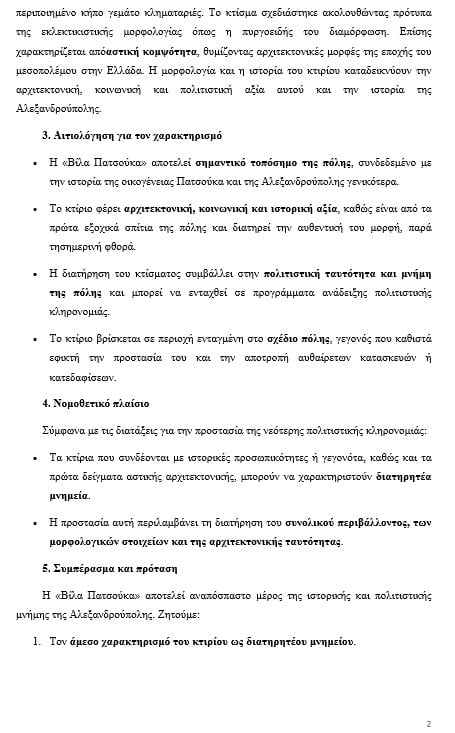 Η τοπική κοινωνία εκφράζει την προσδοκία ότι η Εφορεία Νεωτέρων Μνημείων Ξάνθης θα εξετάσει το αίτημα λαμβάνοντας υπόψη τη σαφή βούληση φορέων και πολιτών για την προστασία της «Βίλας Πατσούκα».