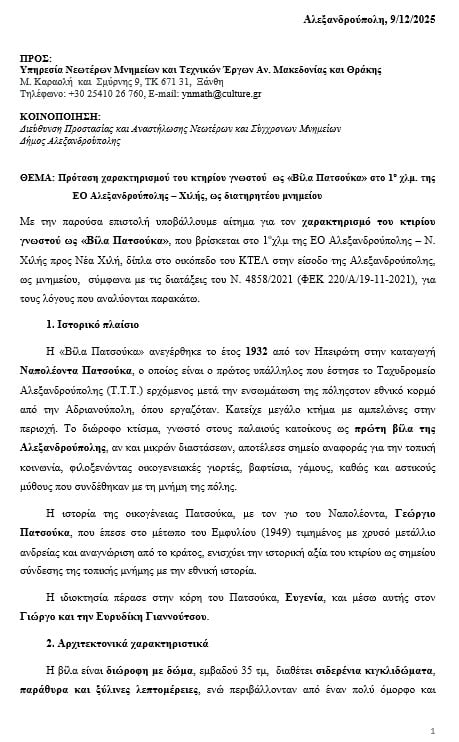 Επίσημο αίτημα προς την Εφορεία Νεωτέρων Μνημείων Ξάνθης του Υπουργείου Πολιτισμού κατατέθηκε για τον χαρακτηρισμό της «Βίλας Πατσούκα» ως διατηρητέου μνημείου, έπειτα από πρωτοβουλία των ιδιοκτητών του ακινήτου, των Φίλων του Γαλλικού Σταθμού Αλεξανδρούπολης, πολιτών της πόλης και της MONUMENTA, αστικής μη κερδοσκοπικής εταιρείας που δραστηριοποιείται στη διάσωση κτιρίων σε Ελλάδα και Κύπρο.