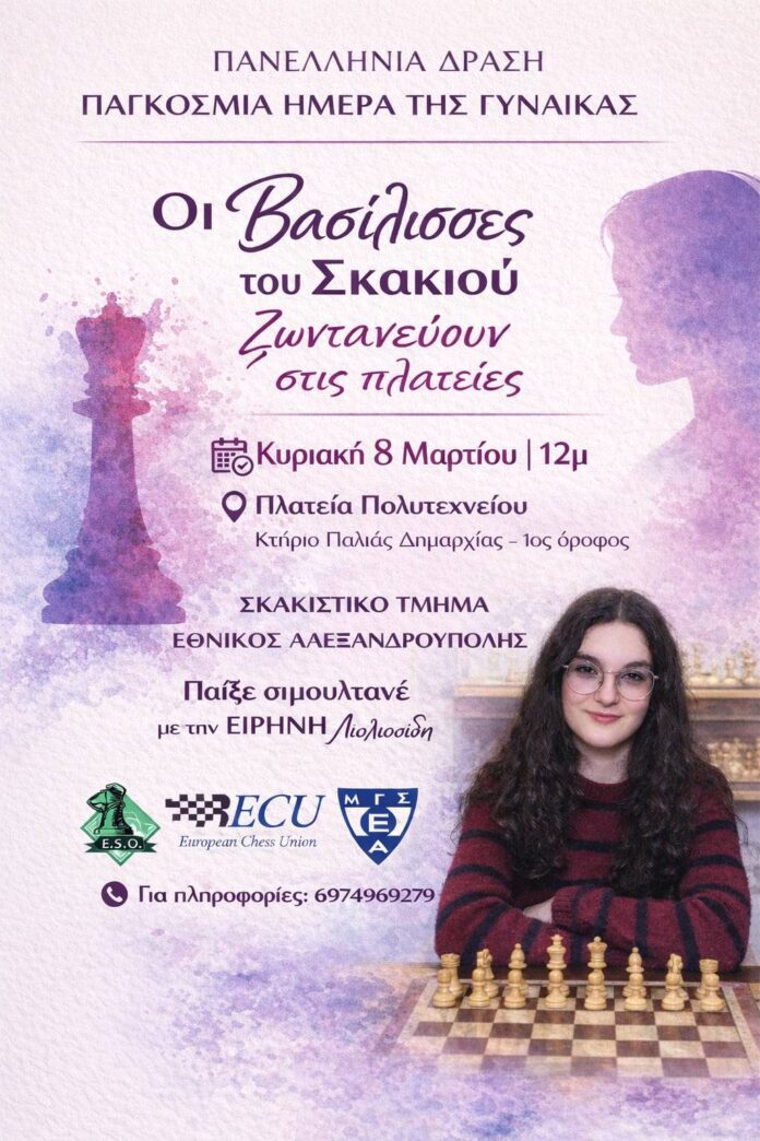 Με αφορμή την International Women’s Day, το Σκακιστικό Τμήμα του Εθνικός Αλεξανδρούπολης διοργανώνει μια ξεχωριστή εκδήλωση την Κυριακή 8 Μαρτίου, συμμετέχοντας στην πανελλήνια δράση «Γυναικείες Κινήσεις, Ζωντανά Τετράγωνα: Το Σκάκι Ενώνει την Ελλάδα».
