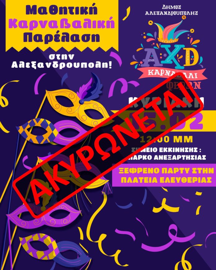 Η μαθητική καρναβαλική παρέλαση που ήταν προγραμματισμένη για την Κυριακή στις 12:00 στην Αλεξανδρούπολη ακυρώνεται, λόγω των έντονων καιρικών φαινομένων που αναμένονται στην περιοχή, όπως ισχυρές βροχές, καταιγίδες και ενισχυμένοι άνεμοι.