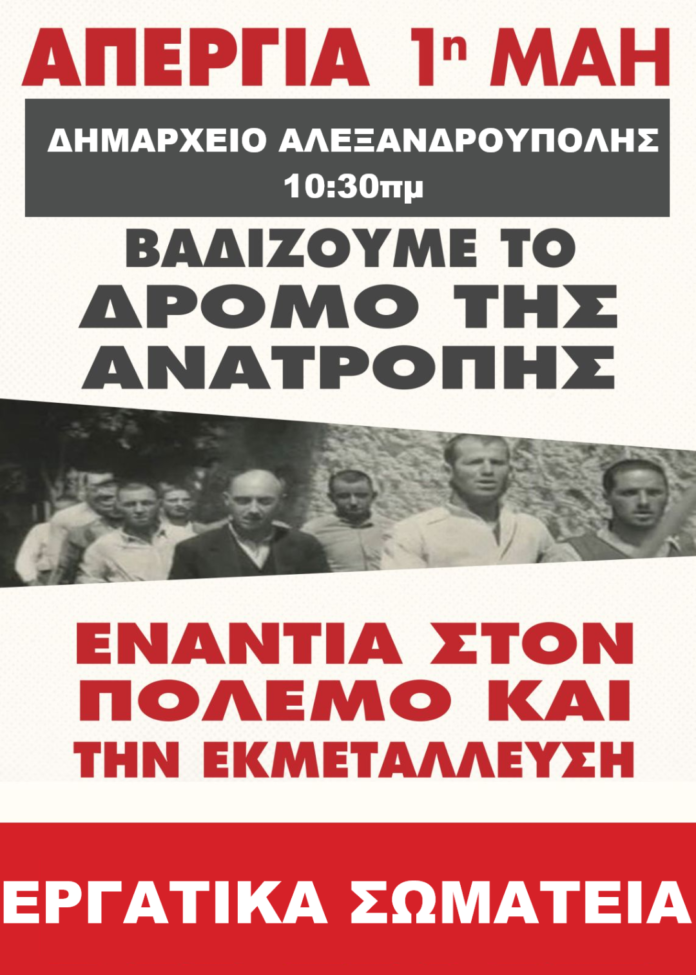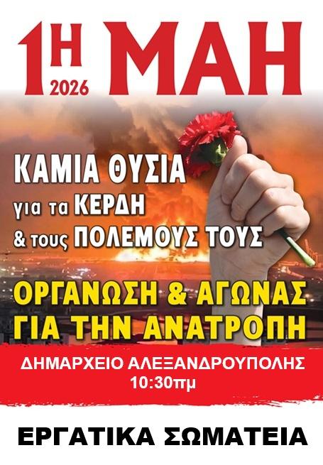 Απεργιακή συγκέντρωση για την Εργατική Πρωτομαγιά θα πραγματοποιηθεί την Παρασκευή 1 Μαΐου 2026, στις 10:30 το πρωί, μπροστά στο Δημαρχείο Αλεξανδρούπολης.