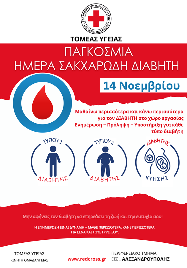 Με αφορμή την Παγκόσμια Ημέρα για τον Σακχαρώδη Διαβήτη που τιμάται στις 14 Νοεμβρίου, το Περιφερειακό Τμήμα του Ελληνικού Ερυθρού Σταυρού Αλεξανδρούπολης και ο Σύλλογος Διαβητικών Ν. Έβρου διοργανώνουν δράση ενημέρωσης και ευαισθητοποίησης του κοινού για την πρόληψη και τη σωστή διαχείριση της νόσου.