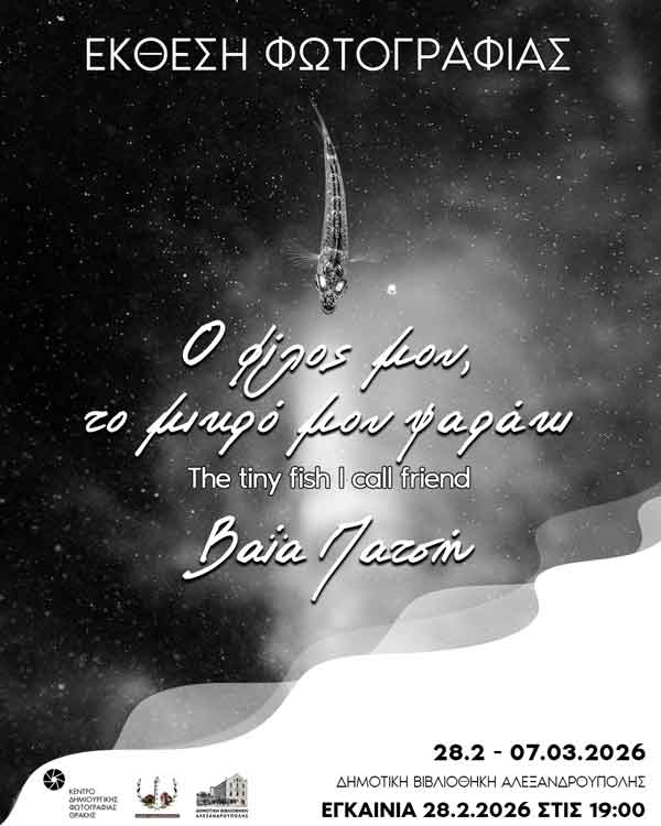 Το Κέντρο Δημιουργικής Φωτογραφίας Θράκης διοργανώνει την έκθεση φωτογραφίας με τίτλο «Ο φίλος μου, το μικρό μου ψαράκι» της φωτογράφου Βαΐα Πατσή, η οποία θα φιλοξενηθεί στη Δημοτική Βιβλιοθήκη Αλεξανδρούπολης, στην Αλεξανδρούπολη, από το Σάββατο 28 Φεβρουαρίου έως και το Σάββατο 7 Μαρτίου 2026.
