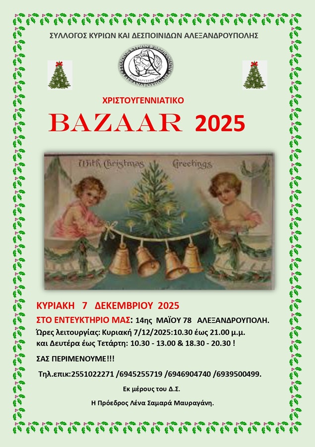 Ο Σύλλογος Κυριών και Δεσποινίδων Αλεξανδρούπολης διοργανώνει και φέτος το ετήσιο Bazaar του, στο εντευκτήριο του Συλλόγου, επί της οδού 14ης Μαΐου 78.