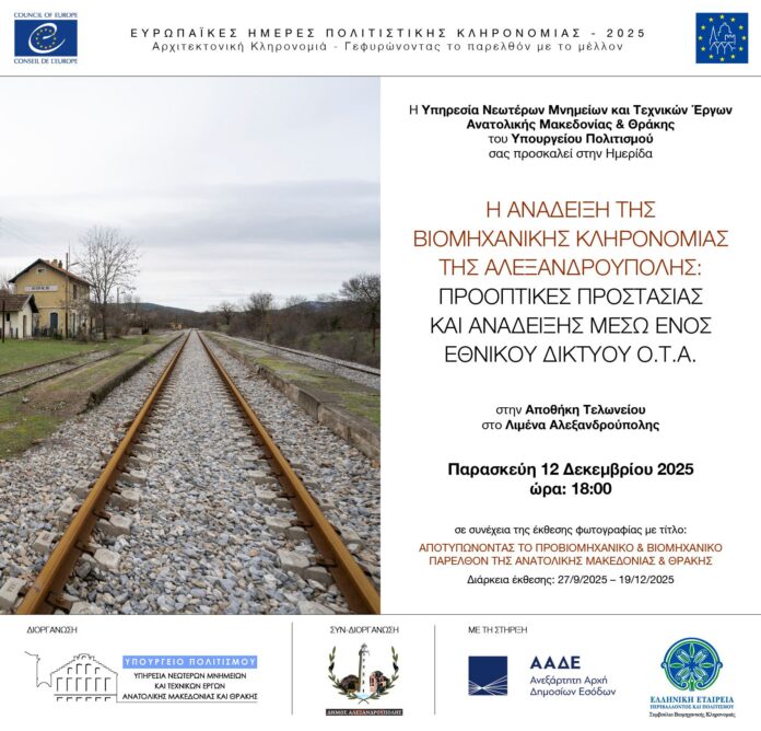 Η Υπηρεσία Νεωτέρων Μνημείων & Τεχνικών Έργων Ανατολικής Μακεδονίας & Θράκης του Υπουργείου Πολιτισμού, διοργανώνει Ημερίδα με τίτλο «Η ΑΝΑΔΕΙΞΗ ΤΗΣ ΒΙΟΜΗΧΑΝΙΚΗΣ ΚΛΗΡΟΝΟΜΙΑΣ ΤΗΣ ΑΛΕΞΑΝΔΡΟΥΠΟΛΗΣ: ΠΡΟΟΠΤΙΚΕΣ ΠΡΟΣΤΑΣΙΑΣ ΚΑΙ ΑΝΑΔΕΙΞΗΣ ΜΕΣΩ ΕΝΟΣ ΕΘΝΙΚΟΥ ΔΙΚΤΥΟΥ Ο.Τ.Α.»