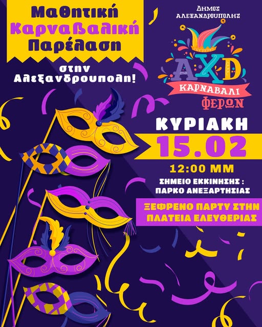 Ο Δήμος Αλεξανδρούπολης καλεί το κοινό να φορέσει τις στολές του, να πάρει μαζί του καλή διάθεση και να γίνει μέρος μιας μεγάλης αποκριάτικης παρέας, γιορτάζοντας την παράδοση και το κέφι των ημερών.