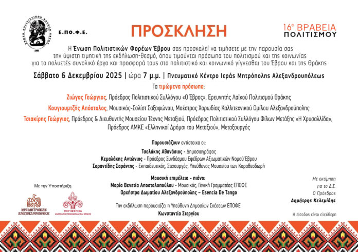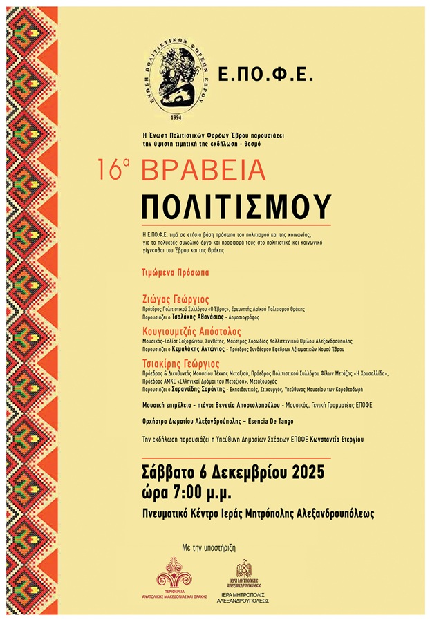 Η Ένωση Πολιτιστικών Φορέων Έβρου (Ε.ΠΟ.Φ.Ε.) διοργανώνει το Σάββατο 6 Δεκεμβρίου 2025, στις 19:00, την καθιερωμένη τιμητική εκδήλωση «Βραβεία Πολιτισμού», στο Πνευματικό Κέντρο της Ιεράς Μητρόπολης Αλεξανδρούπολης.