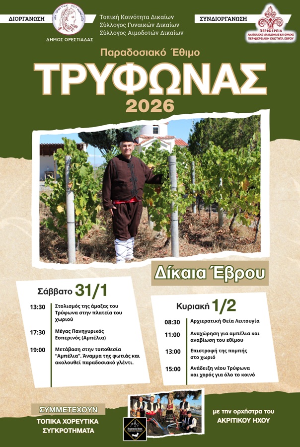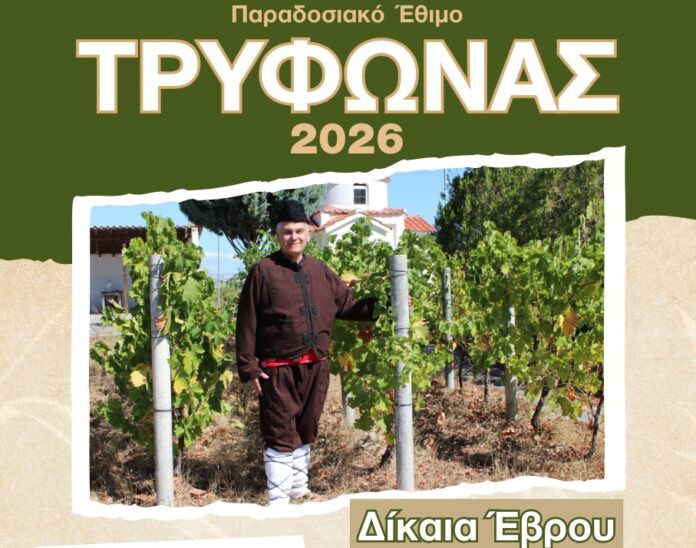 Ο Δήμος Ορεστιάδας, σε συνεργασία με την Περιφέρεια Ανατολικής Μακεδονίας και Θράκης, την τοπική Κοινότητα Δικαίων και συλλόγους του χωριού, προγραμματίζει την αναβίωση του παραδοσιακού εθίμου του Αγίου Τρύφωνα, προστάτη των αμπελουργών, με την εκδήλωση «Τρύφωνας 2026».