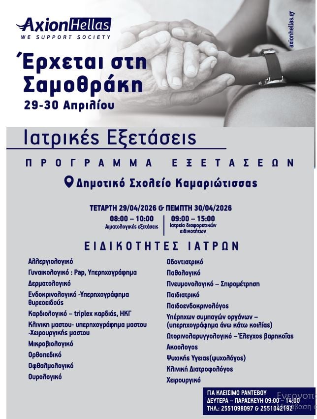 Η Axion Hellas θα βρεθεί στη Σαμοθράκη, προσφέροντας ιατρικές υπηρεσίες διαφόρων ειδικοτήτων στο πλαίσιο δράσης κοινωνικής προσφοράς προς τους κατοίκους του νησιού.