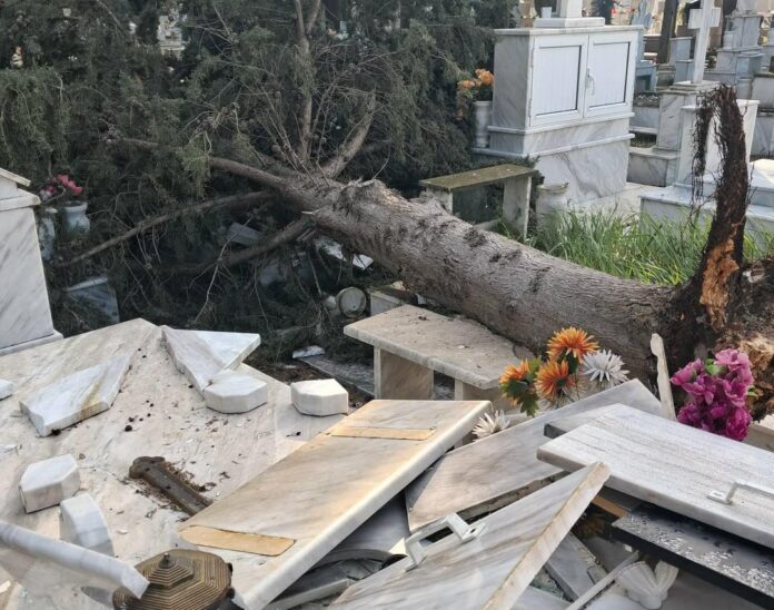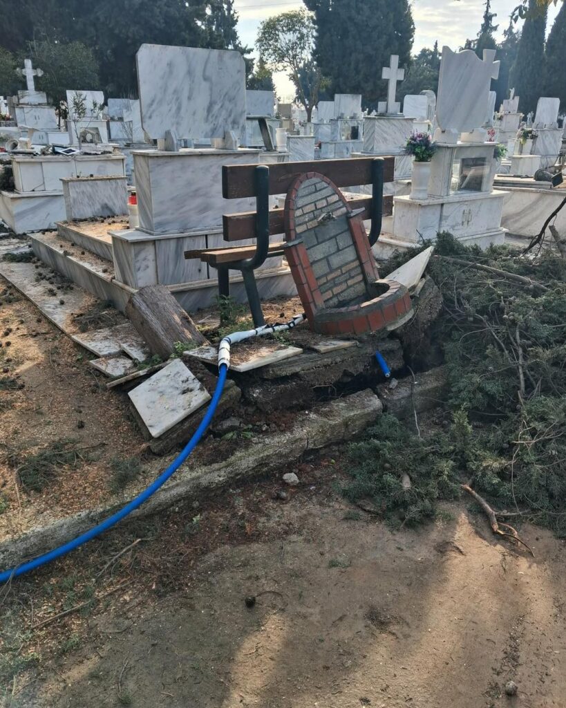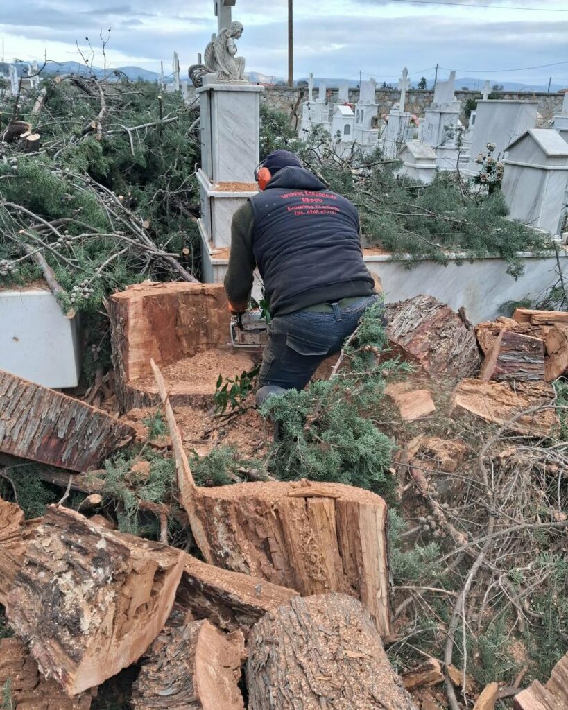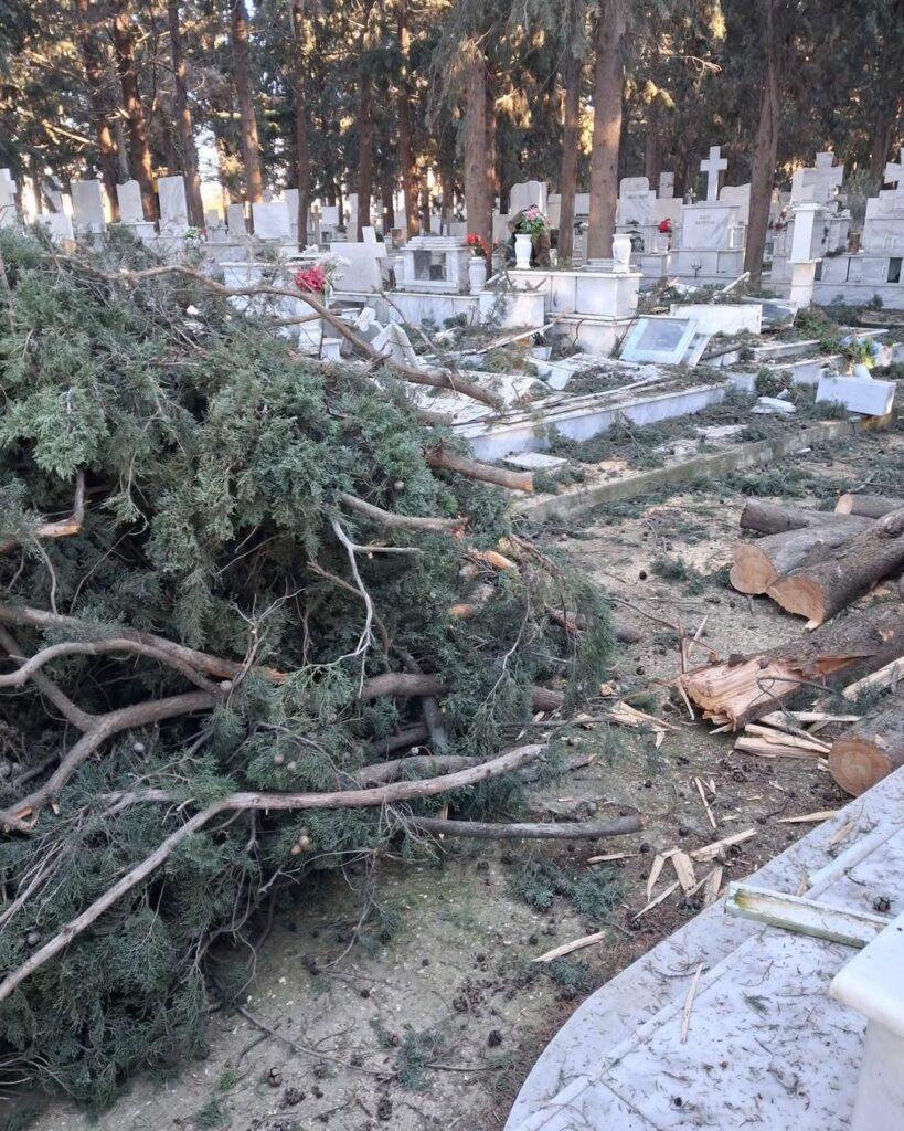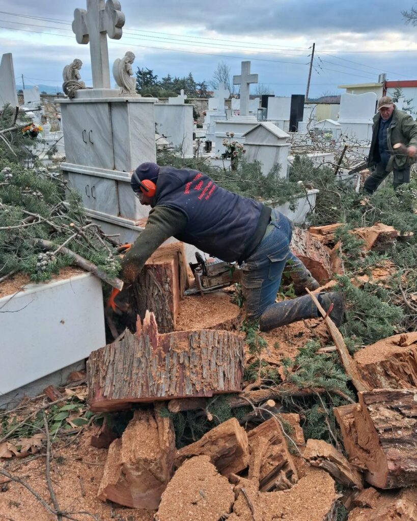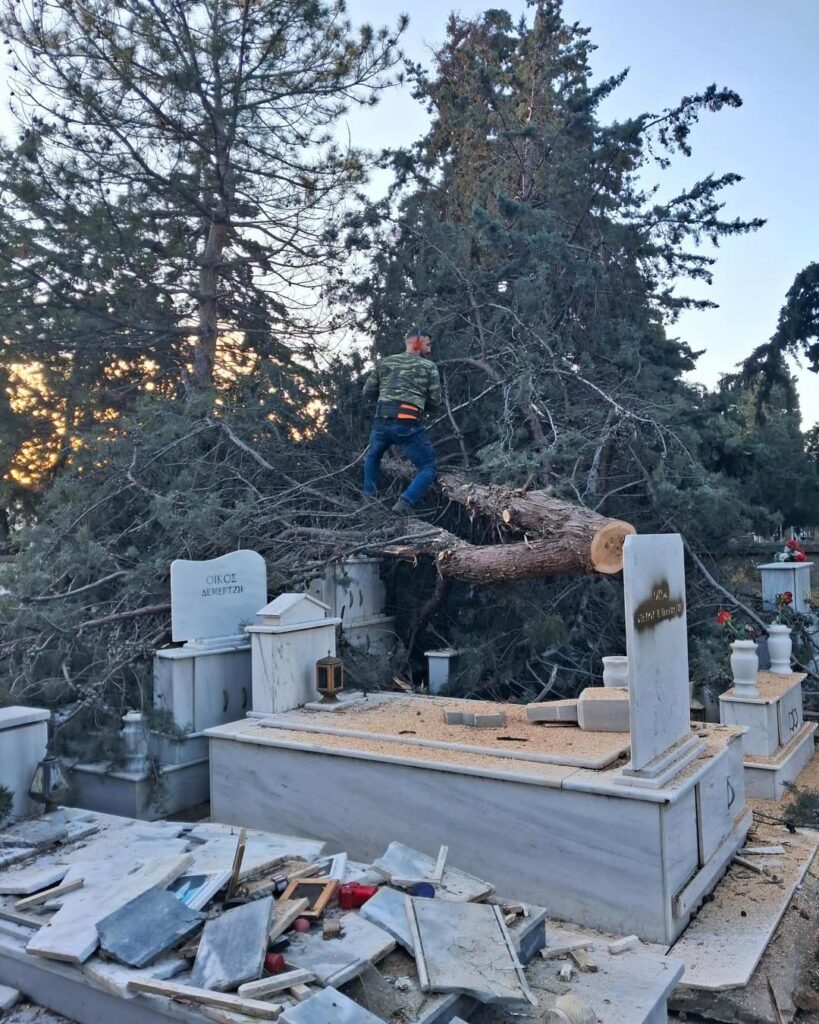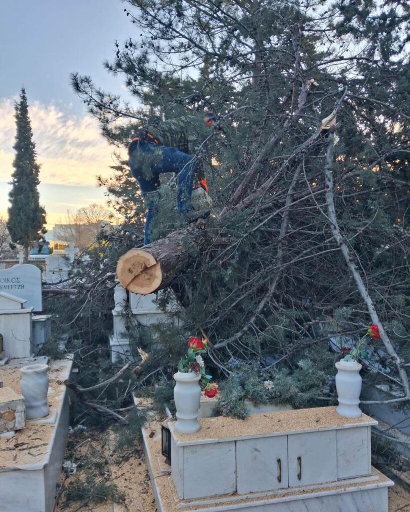 - Στο Α’ Κοιμητήριο, οι βασικές κοπές και απομακρύνσεις έχουν ολοκληρωθεί και απομένουν εργασίες καθαρισμού και τακτοποίησης. Μετά τους τελικούς ελέγχους ασφαλείας, εκτιμάται ότι θα δοθεί εκ νέου σε λειτουργία για το κοινό εντός της επόμενης ημέρας.