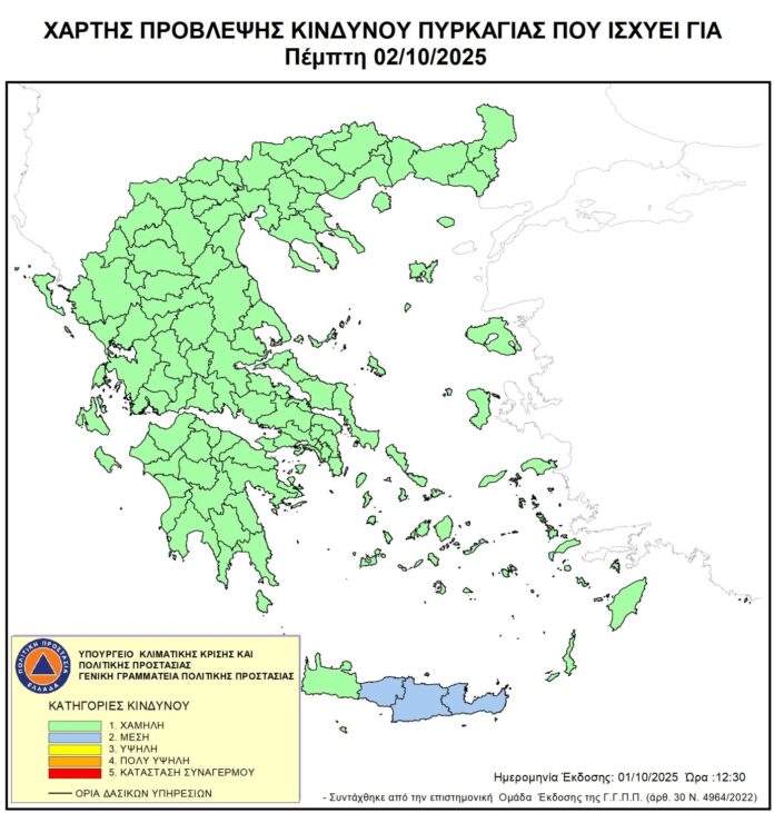 Μέσος κίνδυνος πυρκαγιάς (κατηγορία κινδύνου 2) προβλέπεται σήμερα Πέμπτη σε κάποιες περιοχές της χώρας, σύμφωνα με το Χάρτη Πρόβλεψης Κινδύνου Πυρκαγιάς που εκδίδει η γενική γραμματεία Πολιτικής Προστασίας του υπουργείου Κλιματικής Κρίσης & Πολιτικής Προστασίας (civilprotection.gov.gr).