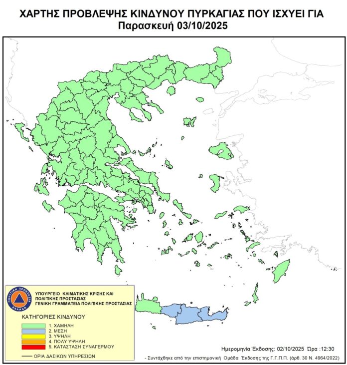 Μέσος κίνδυνος πυρκαγιάς (κατηγορία κινδύνου 2) προβλέπεται σήμερα Παρασκευή σε κάποιες περιοχές της χώρας, σύμφωνα με το Χάρτη Πρόβλεψης Κινδύνου Πυρκαγιάς που εκδίδει η γενική γραμματεία Πολιτικής Προστασίας του υπουργείου Κλιματικής Κρίσης & Πολιτικής Προστασίας (civilprotection.gov.gr).