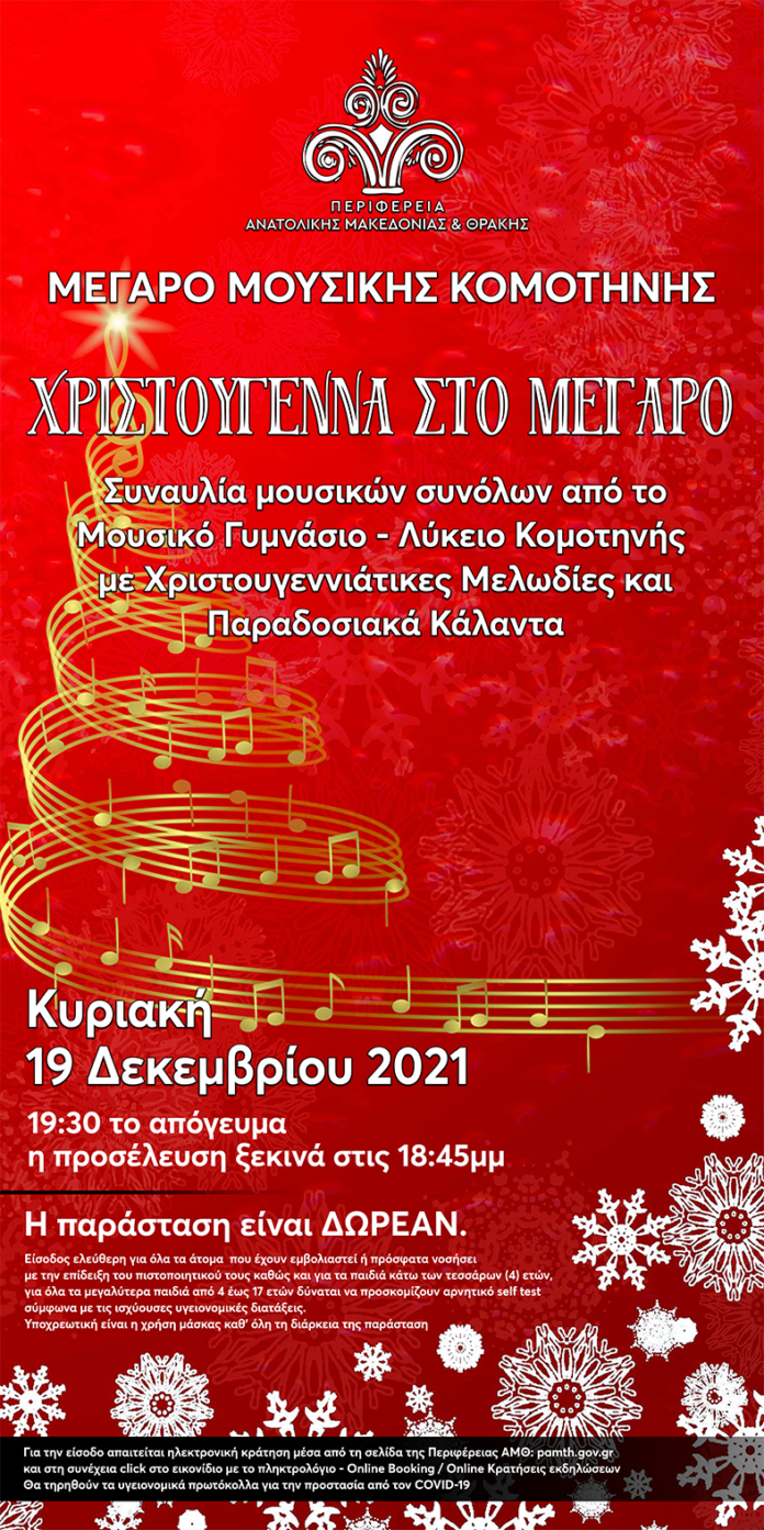 Η Περιφέρεια Ανατολικής Μακεδονίας και Θράκης, στα πλαίσια των εκδηλώσεων «Χριστούγεννα στο Μέγαρο», διοργανώνει σε συνεργασία με το Μουσικό Γυμνάσιο – Λύκειο Κομοτηνής Συναυλία Μουσικών συνόλων με Χριστουγεννιάτικες Μελωδίες και Παραδοσιακά Κάλαντα, την Κυριακή 19 Δεκεμβρίου 2021 και ώρα 19.30 στο Μέγαρο Μουσικής Κομοτηνής.