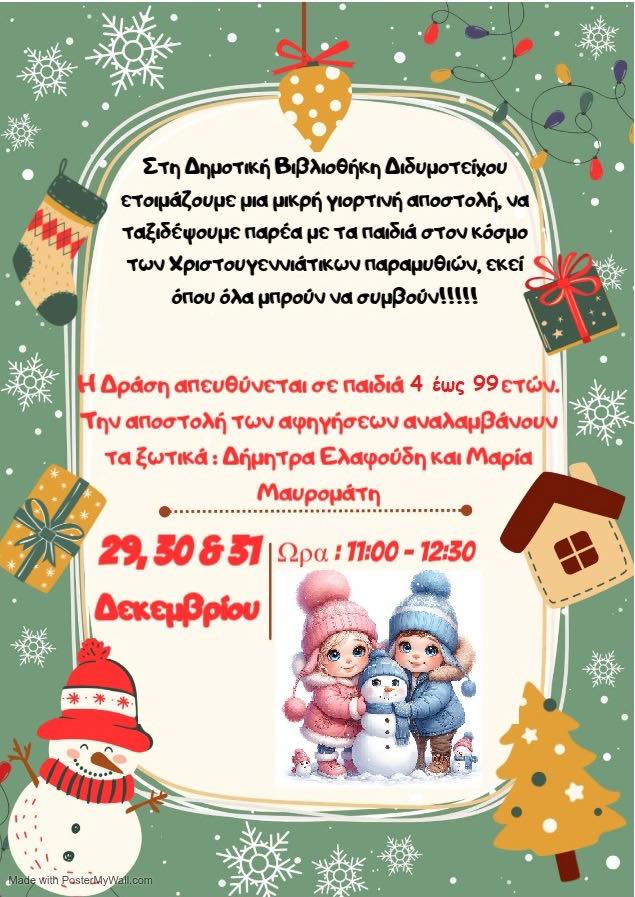 Μια μικρή γιορτινή αποστολή ετοιμάζεται στη Δημοτική Βιβλιοθήκη Διδυμοτείχου, προσκαλώντας μικρούς και μεγάλους σε ένα ταξίδι στον κόσμο των χριστουγεννιάτικων παραμυθιών, εκεί όπου η φαντασία έχει τον πρώτο λόγο και όλα μπορούν να συμβούν.