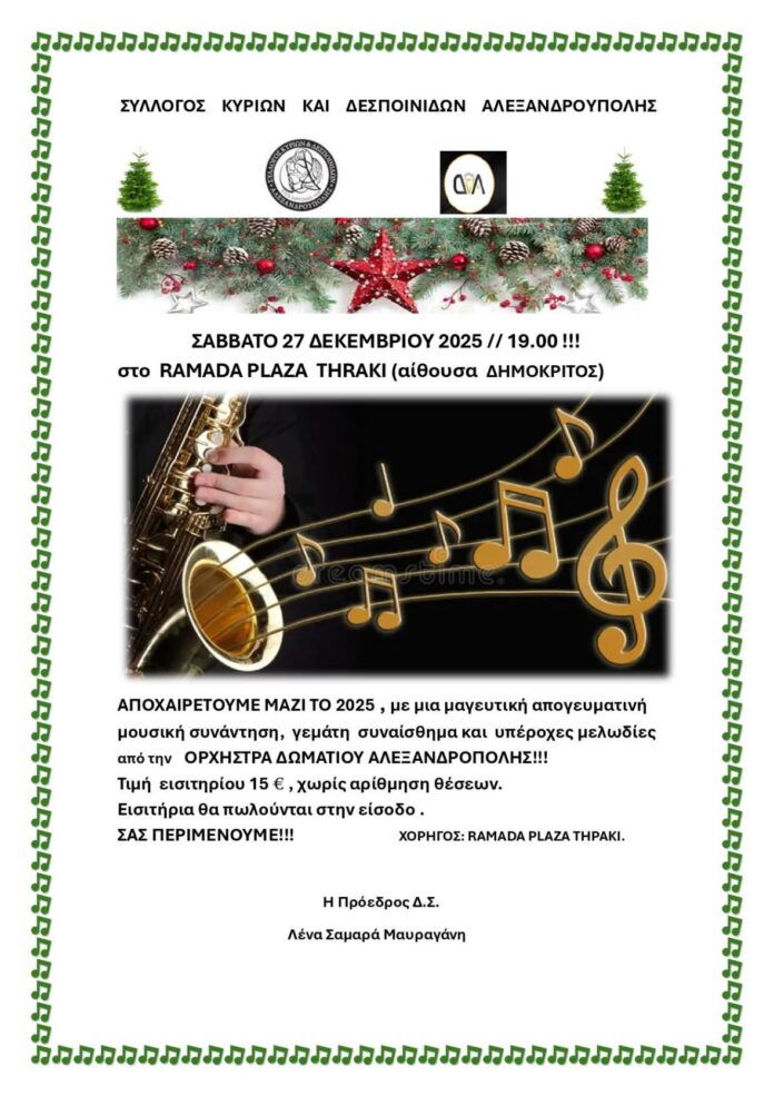 Ο Σύλλογος Κυριών & Δεσποινίδων Αλεξανδρούπολης προσκαλεί τα μέλη του, φίλους και φίλες του Συλλόγου σε μια εορταστική βραδιά με κλασική μουσική, το Σάββατο 27 Δεκεμβρίου 2025, στις 19:00, στον φιλόξενο εκθεσιακό χώρο Δημόκριτο του Ramada Plaza Thraki, ο οποίος παραχωρήθηκε ευγενικά δωρεάν.