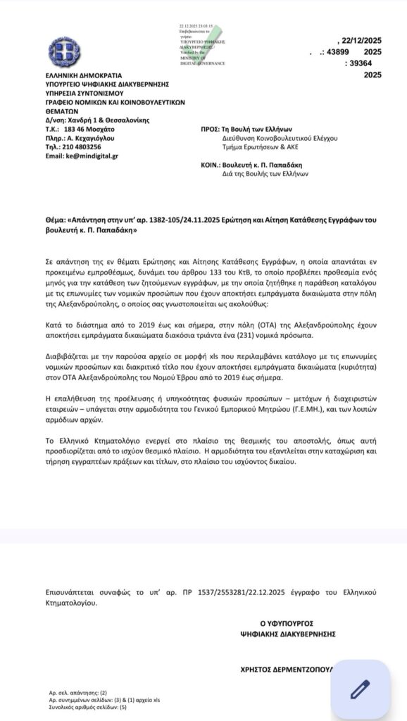Το ζήτημα του λεγόμενου “αθόρυβου εποικισμού” του Έβρου έφερε ξανά στο προσκήνιο η αντιπολίτευση του Δήμου Αλεξανδρούπολης, ζητώντας στοιχεία για την παρουσία ξένων εταιρειών στην περιοχή. Ο Υφυπουργός Ψηφιακής Διακυβέρνησης αρμόδιος για το Κτηματολόγιο και βουλευτής Έβρου, Χρήστος Δερμεντζόπουλος, απαντώντας γραπτώς στον βουλευτή Έβρου της Ελληνικής Λύσης, Πάρη Παπαδάκη, επιβεβαίωσε την ύπαρξη 230 εταιρειών που είχαν αναφερθεί από τον Δήμαρχο Αλεξανδρούπολης, Ιωάννη Ζαμπούκη, σε συνεδρίαση του δημοτικού συμβουλίου στις 19 Δεκεμβρίου.