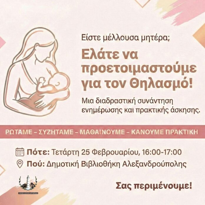 Ο Δήμος Αλεξανδρούπολης διοργανώνει την Τετάρτη 25 Φεβρουαρίου, από τις 16:00 έως τις 17:00, διαδραστική συνάντηση για μέλλουσες μητέρες με θέμα τον θηλασμό, στη Δημοτική Βιβλιοθήκη της πόλης.