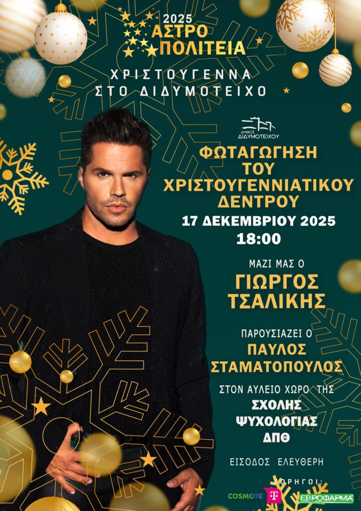 Ο Δήμος Διδυμοτείχου προσκαλεί κατοίκους και επισκέπτες στη φωταγώγηση του Χριστουγεννιάτικου δέντρου, που θα πραγματοποιηθεί την Τετάρτη 17 Δεκεμβρίου 2025, στις 18:00, μπροστά από τη Σχολή Ψυχολογίας.
