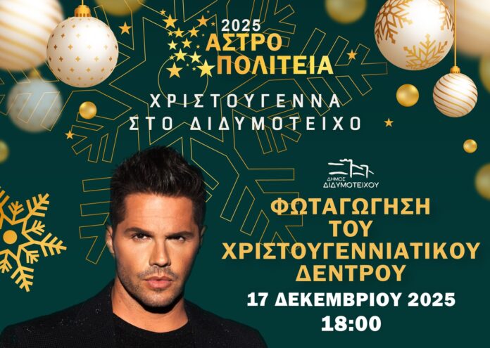 Ο Δήμος Διδυμοτείχου προσκαλεί κατοίκους και επισκέπτες στη φωταγώγηση του Χριστουγεννιάτικου δέντρου, που θα πραγματοποιηθεί την Τετάρτη 17 Δεκεμβρίου 2025, στις 18:00, μπροστά από τη Σχολή Ψυχολογίας.