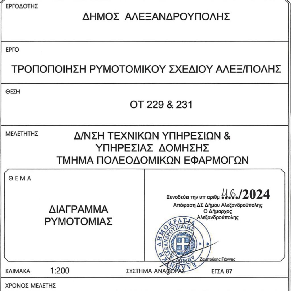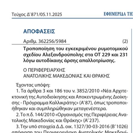 Με τη δημοσίευση του ΦΕΚ Δ’ 871/05.11.2025 και σύμφωνα με την υπ’ αριθμ. 116/2024 Απόφαση του Δημοτικού Συμβουλίου Αλεξανδρούπολης, ολοκληρώθηκε η τροποποίηση του εγκεκριμένου ρυμοτομικού σχεδίου στα Οικοδομικά Τετράγωνα 229 και 231, λόγω αυτοδίκαιης άρσης απαλλοτρίωσης.
