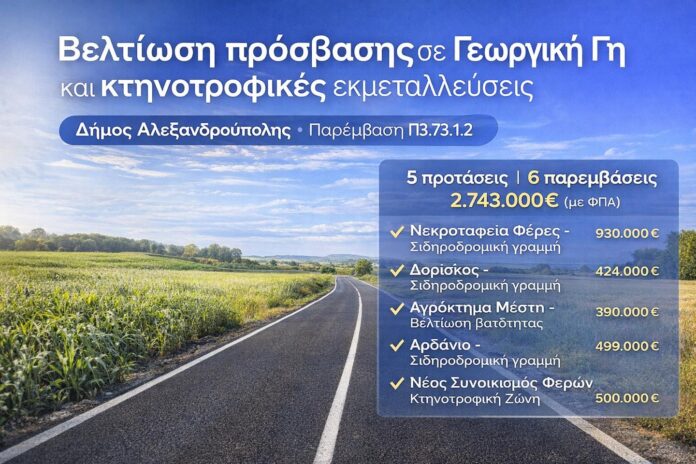 Ο Δήμος Αλεξανδρούπολης έχει ολοκληρώσει τη διαδικασία υποβολής προτάσεων στο πλαίσιο της πρόσκλησης Π3.73.1.2 «Βελτίωση πρόσβασης σε Γεωργική Γη και Κτηνοτροφικές Εκμεταλλεύσεις» του Υπουργείο Αγροτικής Ανάπτυξης και Τροφίμων. Στο τελικό στάδιο, κατατέθηκαν όλες οι παρατηρήσεις, διευκρινίσεις και απαραίτητες λεπτομέρειες, εξασφαλίζοντας πλήρη τεκμηρίωση και ωρίμανση των φακέλων.