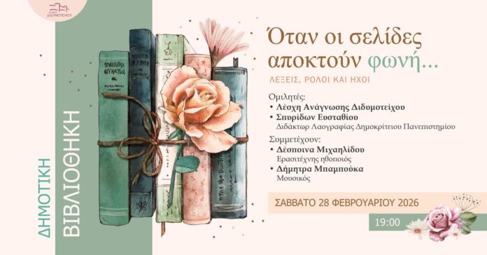 Το Τμήμα Πολιτισμού και Εθελοντισμού του Δήμου Διδυμοτείχου διοργανώνει το Σάββατο 28 Φεβρουαρίου 2026, στις 19:00, στην Δημοτική Βιβλιοθήκη Διδυμοτείχου, την πολιτιστική εκδήλωση «Όταν οι σελίδες αποκτούν φωνή».