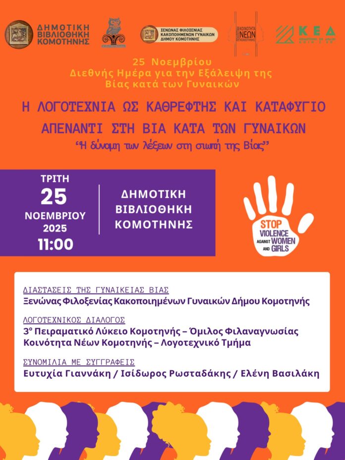 Η Δημοτική Βιβλιοθήκη Κομοτηνής, σε συνεργασία με την ΚΟΙΝΣΕΠ «Κομοτηνή Εν Δράσει», τον Ξενώνα Φιλοξενίας Κακοποιημένων Γυναικών του Δήμου Κομοτηνής, τον Όμιλο Φιλαναγνωσίας του 3ου Πειραματικού ΓΕΛ και το Λογοτεχνικό Τμήμα της Κοινότητας Νέων, διοργανώνει την Τρίτη 25 Νοεμβρίου 2025, στις 11:00 πμ, ειδική εκδήλωση με αφορμή την Παγκόσμια Ημέρα για την Εξάλειψη της Βίας κατά των Γυναικών.
