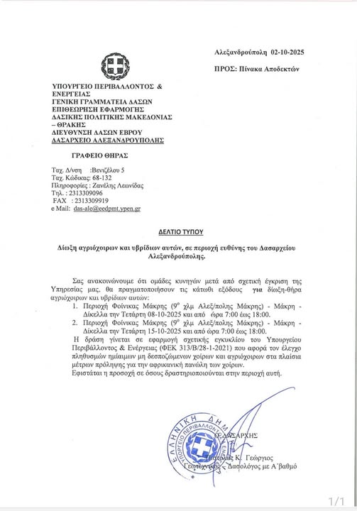 Δίωξη αγριογούρουνων σε περιοχές ευθύνης του Δασαρχείου Αλεξανδρούπολης