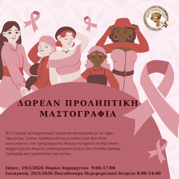 Στον Νομό Ροδόπης θα βρεθεί από τη Δευτέρα 16 έως και την Παρασκευή 20 Φεβρουαρίου 2026 η Κινητή Μονάδα Μαστογράφου της Ελληνική Αντικαρκινική Εταιρεία, στο πλαίσιο του προγράμματος ευαισθητοποίησης και έγκαιρης διάγνωσης του καρκίνου του μαστού.