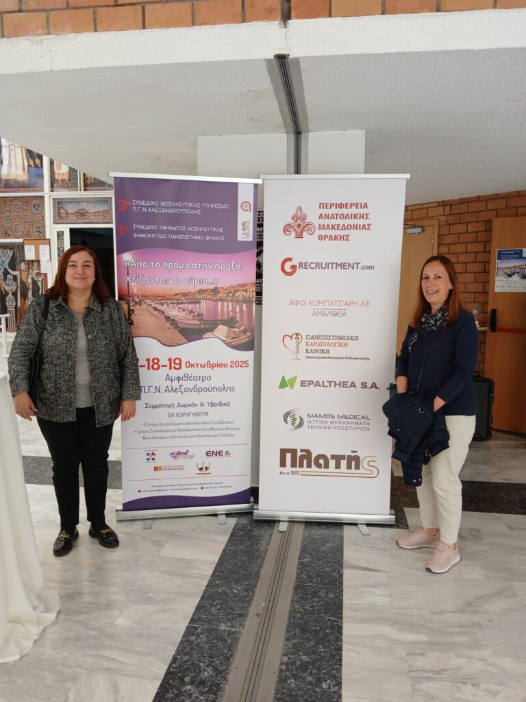 Από τις 17 έως τις 19 Οκτωβρίου 2025, πραγματοποιήθηκε στο Νοσοκομείο Αλεξανδρούπολης συνέδριο της Νοσηλευτικής Υπηρεσίας, με στόχο την ανάδειξη σύγχρονων θεμάτων και εξελίξεων στη Νοσηλευτική Επιστήμη, την ενίσχυση της επιστημονικής γνώσης και τη διεπιστημονική συνεργασία στον χώρο της Υγείας. Οι Νοσηλεύτριες-Εκπαιδεύτριες του τμήματος συμμετείχαν στις 19 Οκτωβρίου.