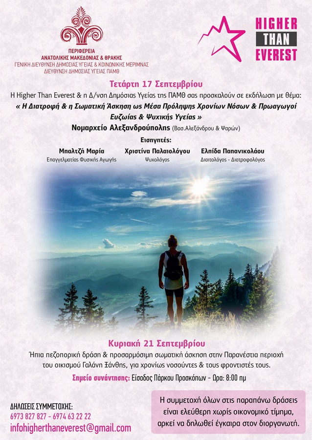 Την Τετάρτη 17 Σεπτεμβρίου, ώρα 19:00, στο Νομαρχείο Αλεξανδρούπολης, θα πραγματοποιηθεί ενημερωτική δράση ευαισθητοποίησης με θεματικές: Επαφή με την φύση – μια ξεχασμένη ανθρώπινη αναγκαιότητα, Ψυχολογική αρωγή & ψυχική ανακούφιση για νοσούντες αλλά και φροντιστές, Ένταξη στην καθημερινότητα της ήπιας & ατομικά προσαρμόσιμης σωματικής άσκησης, Εφαρμογή επιστημονικά επίκαιρων πρωτοκόλλων υγιεινής διατροφής.