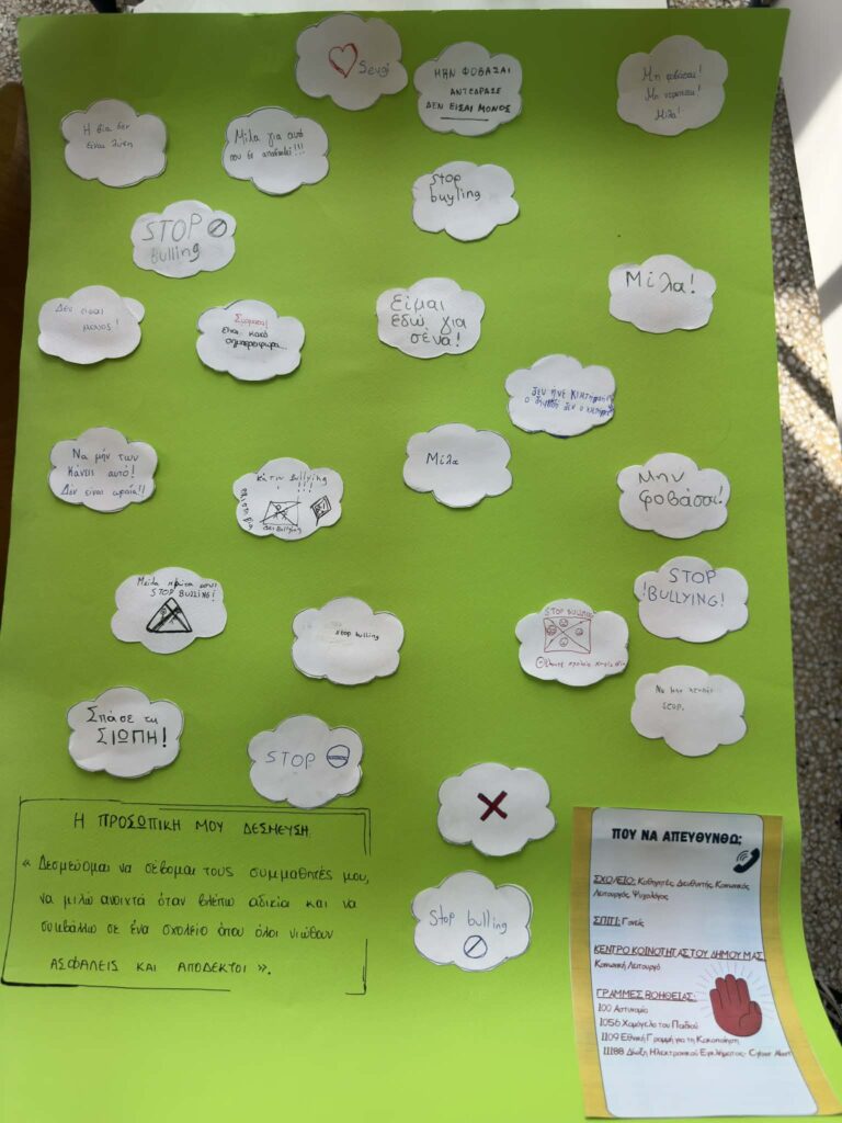 Μέσα από ομαδικές εργασίες, τα παιδιά κατέγραψαν μηνύματα κατά του εκφοβισμού και υπέγραψαν τη δική τους «Ασπίδα κατά της Βίας». Οι εκπρόσωποι του Κέντρου Κοινότητας με Παράρτημα Ρομά τόνισαν τη σημασία της συνεχούς υποστήριξης των παιδιών και της συνεργασίας σχολείων, οικογενειών και θεσμών για τη διασφάλιση ενός ασφαλούς και συμπεριληπτικού περιβάλλοντος.