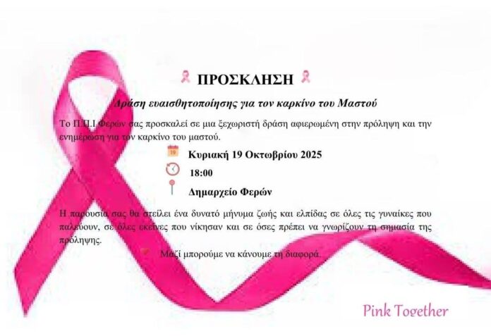 Το Πολυδύναμο Περιφερειακό Ιατρείο Φερών του Κέντρου Υγείας Σουφλίου, στο πλαίσιο της ενημέρωσης και ευαισθητοποίησης του κοινού για την πρόληψη και έγκαιρη διάγνωση του καρκίνου του μαστού, διοργανώνει μια ξεχωριστή δράση την Κυριακή 19 Οκτωβρίου 2025, στις 18:00 μ.μ., στο ΚΑΠΗ Φερών.