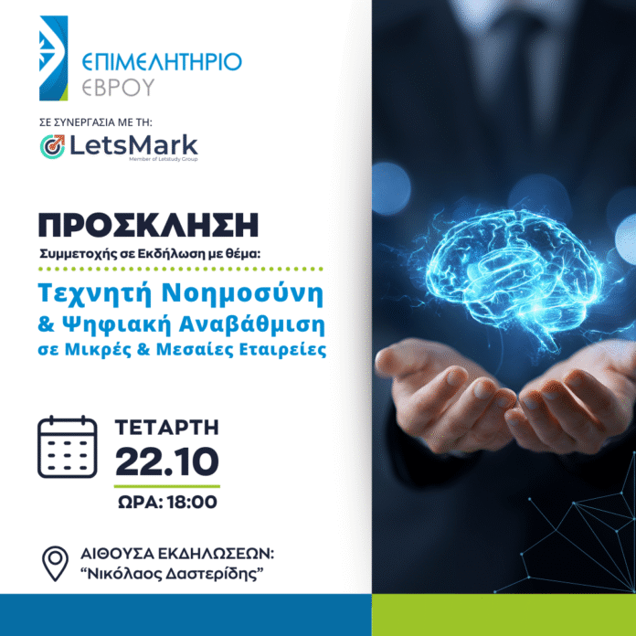 Το Επιμελητήριο Έβρου, σε συνεργασία με την Εταιρεία Συμβούλων Πληροφορικής LetsMark, διοργανώνει ενημερωτική εκδήλωση την Τετάρτη 22 Οκτωβρίου 2025, στις 18.00, με στόχο να παρουσιαστούν οι τρόποι με τους οποίους η Τεχνητή Νοημοσύνη μπορεί να αξιοποιηθεί άμεσα στις Μικρές και Μεσαίες Εταιρείες.