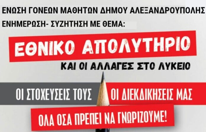 Εκδήλωση – συζήτηση με θέμα το Εθνικό Απολυτήριο και τις προωθούμενες αλλαγές στο Λύκειο διοργανώνει η Ένωση Συλλόγων Γονέων του Δήμου Αλεξανδρούπολης.