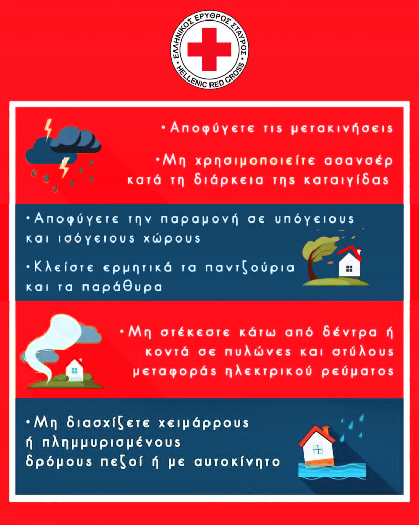 Ο Ελληνικός Ερυθρός Σταυρός (Ε.Ε.Σ.) εξέδωσε οδηγίες για την προστασία των πολιτών από τις σφοδρές καταιγίδες και τα πλημμυρικά φαινόμενα που πλήττουν τη χώρα. Ο Τομέας Σαμαρειτών, Διασωστών & Ναυαγοσωστών προτείνει δέκα βασικές ενέργειες για την ασφάλεια των πολιτών, τόσο κατά τη διάρκεια όσο και μετά την καταιγίδα.