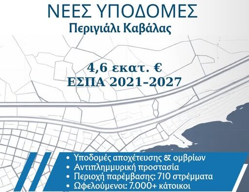 Ο Περιφερειάρχης Ανατολικής Μακεδονίας και Θράκης, Χριστόδουλος Τοψίδης, υπέγραψε την ένταξη του έργου για την κατασκευή υποδομών αποχέτευσης ακαθάρτων και ομβρίων στο Περιγιάλι Καβάλας, προϋπολογισμού 4,6 εκατ. ευρώ, στο πλαίσιο του Προγράμματος «Ανατολική Μακεδονία και Θράκη 2021-2027».