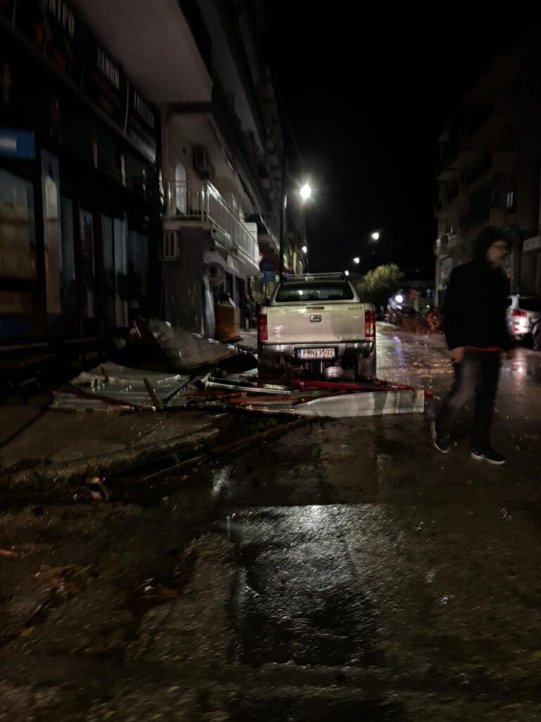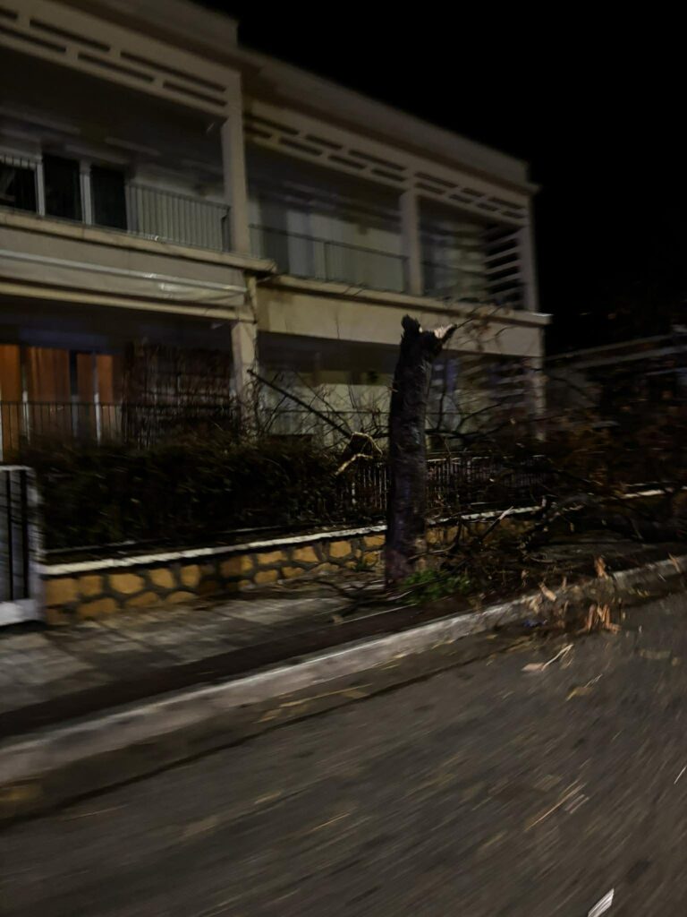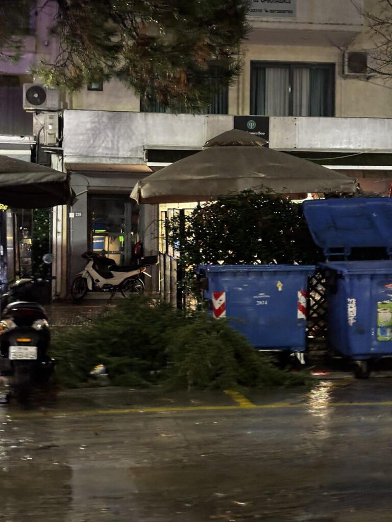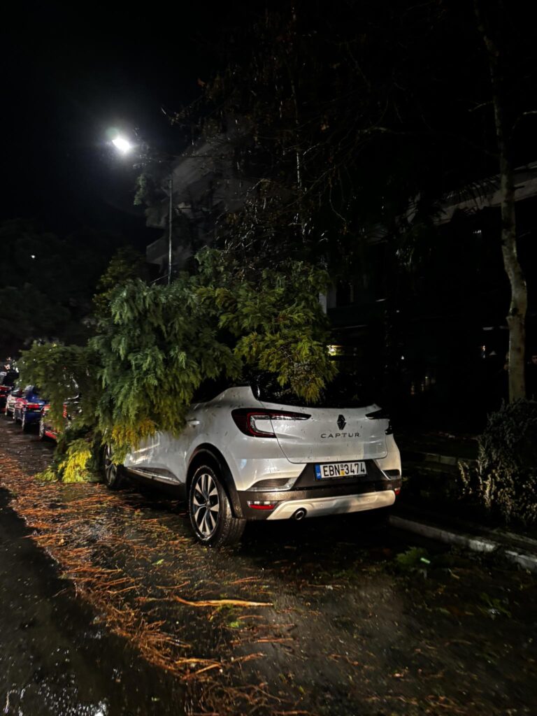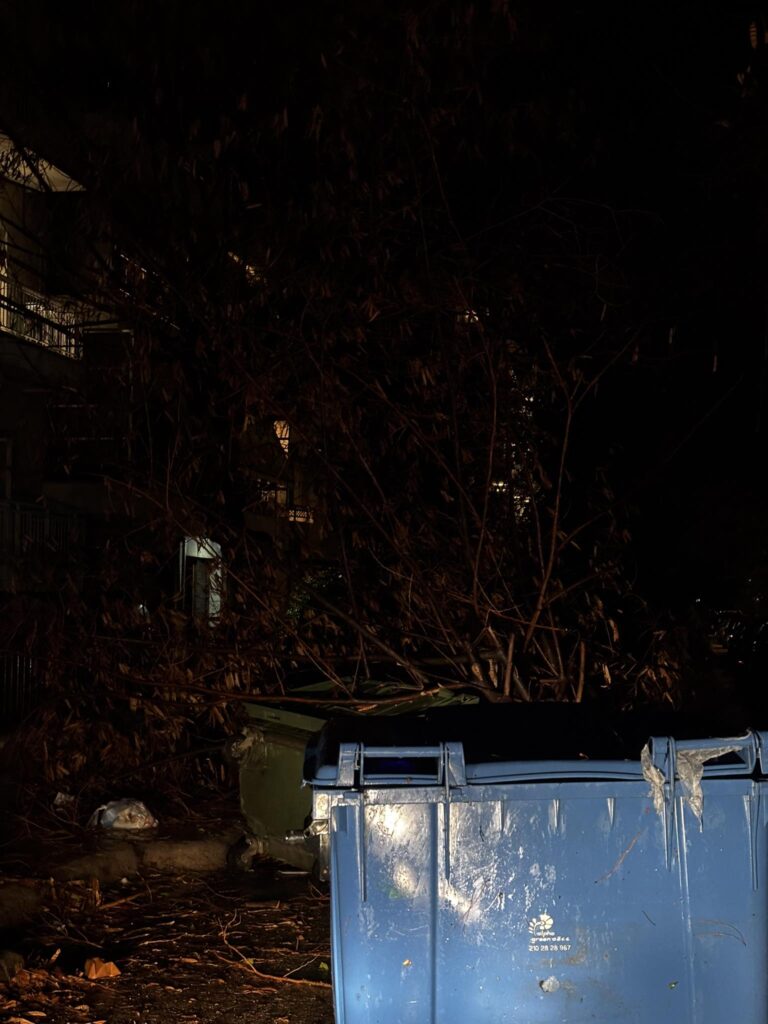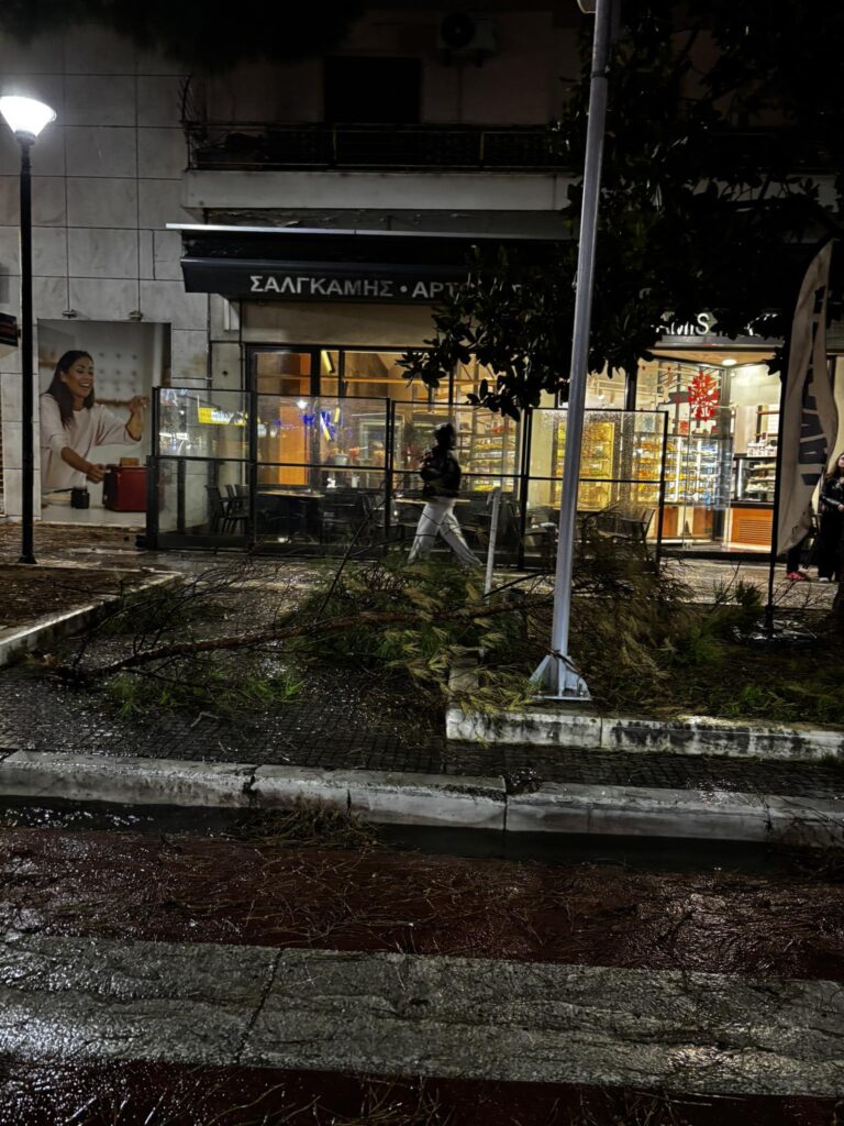 Η κατάσταση σε κεντρικούς δρόμους είναι χαοτική, με κάδους απορριμμάτων να αναποδογυρίζονται από ριπές ανέμου και φερτά υλικά να εμποδίζουν την κυκλοφορία. Πολλά δέντρα έπεσαν σε πεζοδρόμια και οδοστρώματα, με τουλάχιστον δύο οχήματα να έχουν υποστεί σοβαρές γρατζουνιές και λαμαρίνες από πτώσεις κλαδιών — σύμφωνα με φωτογραφίες και βίντεο που αναρτώνται στα social media από κατοίκους της περιοχής.