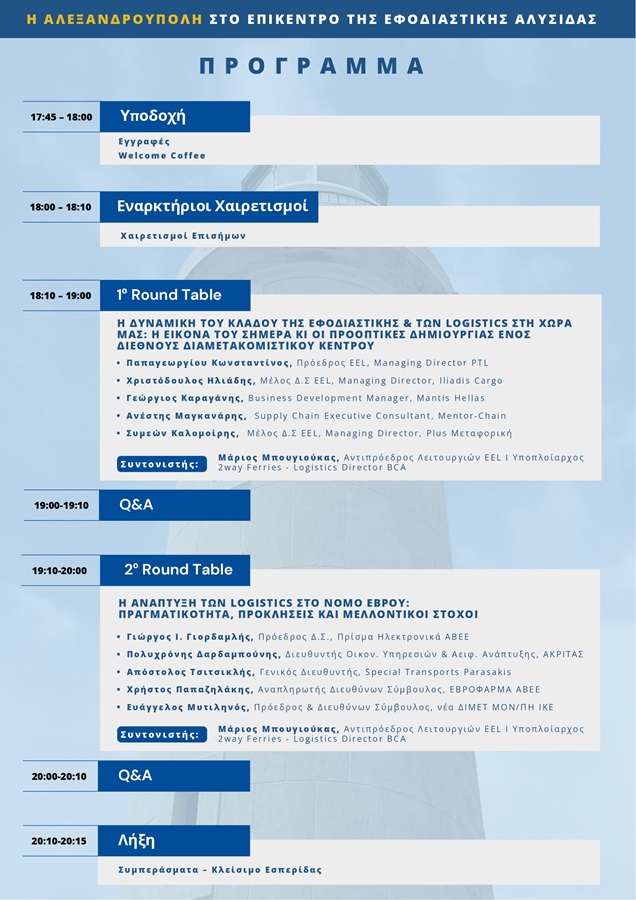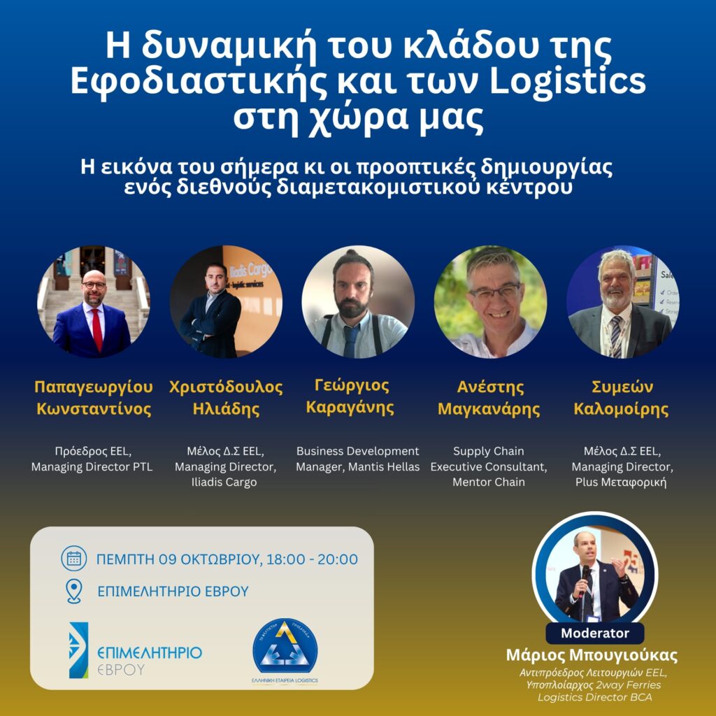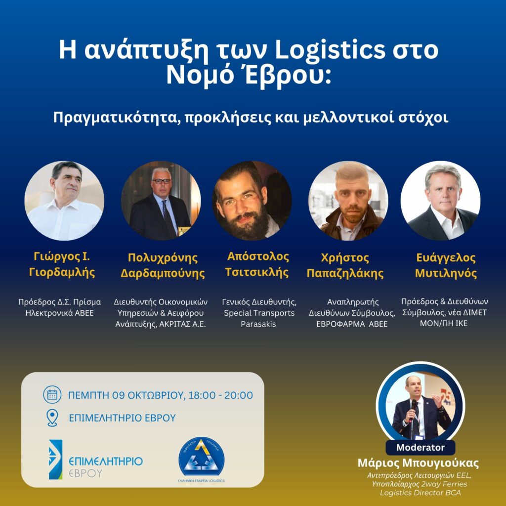 Επιχειρηματική Εσπερίδα διοργανώνει το Επιμελητηρίου Έβρου και η Ελληνική Εταιρεία Logistics με θέμα “Η Αλεξανδρούπολη στο επίκεντρο της εφοδιαστικής αλυσίδας” , η οποία θα πραγματοποιηθεί στο Επιμελητήριο Έβρου στην αίθουσα ΝΙΚΟΛΑΟΣ ΔΑΣΤΕΡΙΔΗΣ (3ος όροφος), την Πέμπτη 9 Οκτωβρίου 2025 και ώρα 18:00.