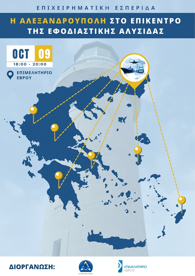 Επιχειρηματική Εσπερίδα διοργανώνει το Επιμελητηρίου Έβρου και η Ελληνική Εταιρεία Logistics με θέμα “Η Αλεξανδρούπολη στο επίκεντρο της εφοδιαστικής αλυσίδας” , η οποία θα πραγματοποιηθεί στο Επιμελητήριο Έβρου στην αίθουσα ΝΙΚΟΛΑΟΣ ΔΑΣΤΕΡΙΔΗΣ (3ος όροφος), την Πέμπτη 9 Οκτωβρίου 2025 και ώρα 18:00.