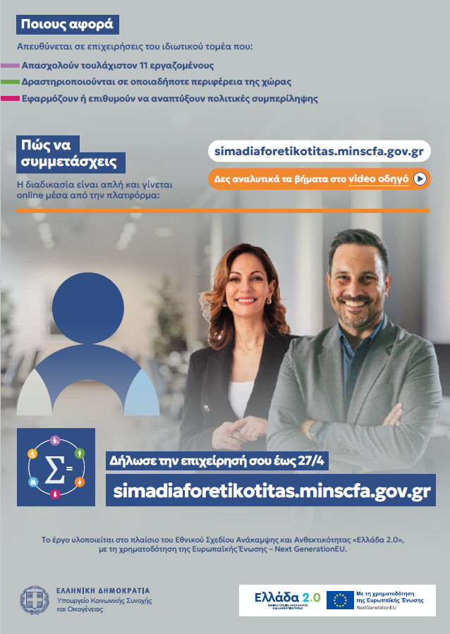 Η εκδήλωση φιλοδοξεί να αναδείξει τη σημασία του «Σήματος Διαφορετικότητας» ως εργαλείου ενίσχυσης οργανισμών και επιχειρήσεων που υιοθετούν πολιτικές ίσων ευκαιριών και ενεργά προάγουν ένα συμπεριληπτικό περιβάλλον. Στο πλαίσιο της Ημερίδας θα παρουσιαστούν πρακτικές, σύγχρονες προσεγγίσεις και θεσμικές πρωτοβουλίες που συμβάλλουν στην ενδυνάμωση της διαφορετικότητας.