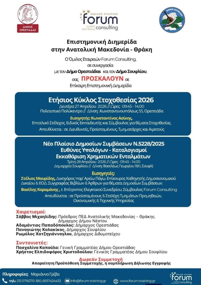 Επιστημονική ημερίδα με θέμα τον «Ετήσιο Κύκλο Στοχοθεσίας 2026» διοργανώνει ο Δήμος Ορεστιάδας, σε συνεργασία με τον Όμιλο Φορουμ Συμβουλευτική.