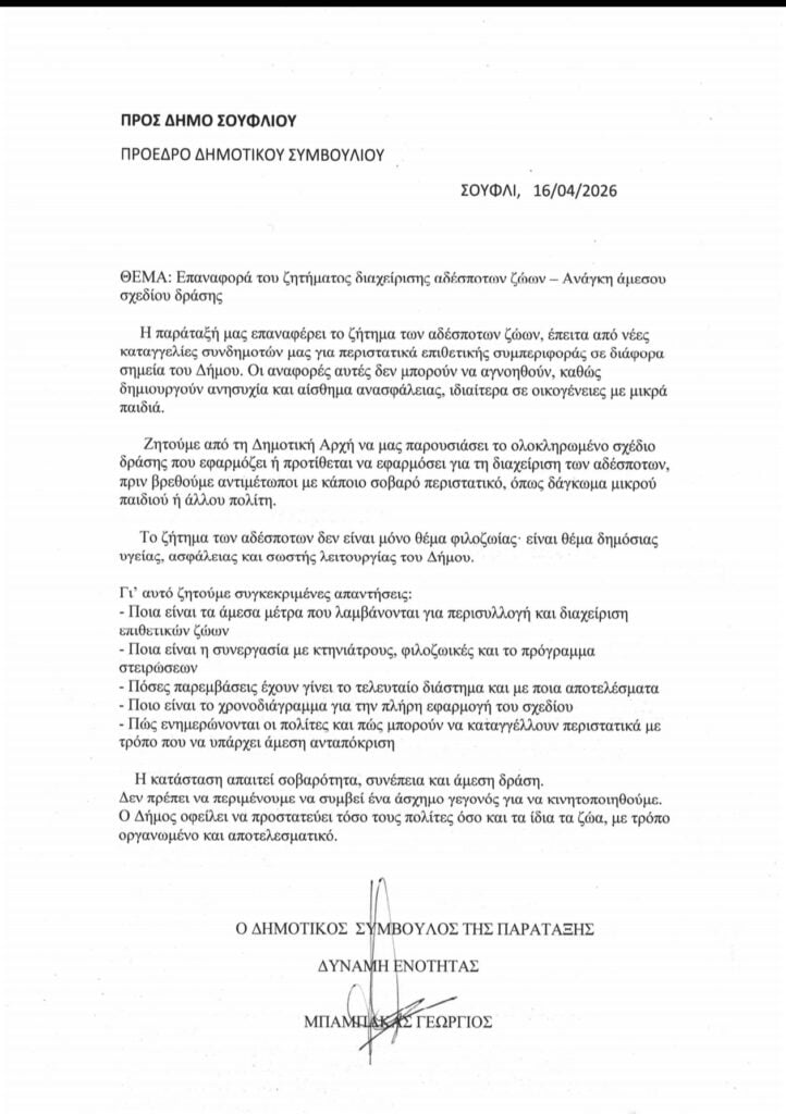 Σοβαρό περιστατικό σημειώθηκε στο Σουφλί, όταν κάτοικος της περιοχής δέχθηκε επίθεση από αδέσποτο σκύλο, με αποτέλεσμα τον τραυματισμό του και τη μεταφορά του στο Κέντρο Υγείας για την παροχή πρώτων βοηθειών. Το περιστατικό έχει καταγραφεί από την Αστυνομία, όπως προβλέπεται.
