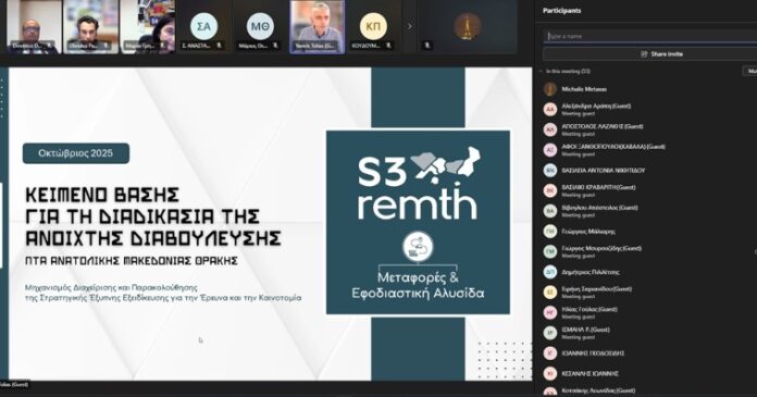 Ο Προϊστάμενος της Ειδικής Υπηρεσίας Διαχείρισης του Προγράμματος ΑΜ-Θ 2021-2027 παρουσίασε τις βασικές αρχές της προσεχούς πρόσκλησης για έργα έρευνας και καινοτομίας επιχειρήσεων, ενώ στη συνέχεια παρουσιάστηκε το κείμενο βάσης της Συμβουλευτικής Ομάδας, που κατέληξε σε ιεραρχημένη επιλογή περιφερειακών απολήξεων, ακολουθούμενη από συζήτηση για τα εργαλεία πολιτικής που θα τις υποστηρίξουν.