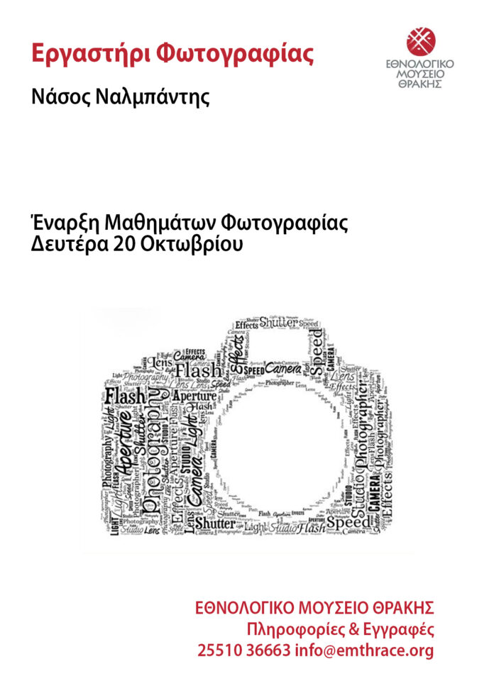 Το Εθνολογικό Μουσείο Θράκης διοργανώνει, σε συνεργασία με τον φωτογράφο Νάσο Ναλμπάντη, ένα εργαστήρι φωτογραφίας διάρκειας 8 συναντήσεων, που υπόσχεται να μυήσει τους συμμετέχοντες στην τέχνη της φωτογραφικής δημιουργίας.